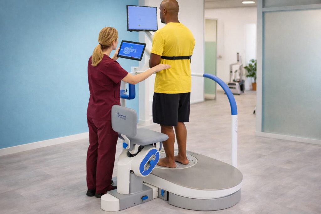 Mit SmartAssist können wir das Gleichgewicht der Patienten besser trainieren und sie beim Übergang vom Sitzen zum Stehen unterstützen. Ein mobiles Gehtraining auf begrenztem Raum ist ebenfalls möglich.