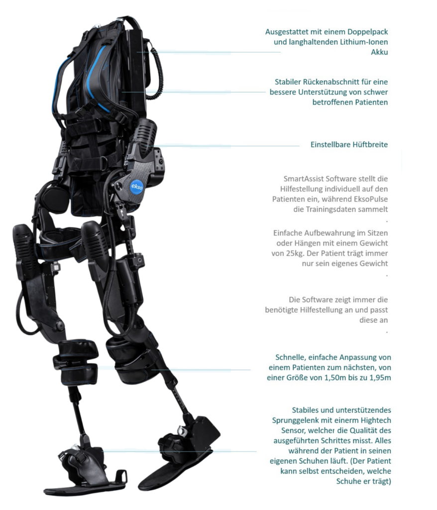 Das Neuro-Robotik-Zentrum- München arbeitet mit dem EksoNR der neuesten Generation, welches mit einer starken neuen Software ausgestattet ist, Echtzeit-Feedback liefert und mit dem EksoView Touchscreen controller ausgestattet ist. Verglichen mit anderen Anwendungen in der Industrie, ist mit dem EksoNR das natürlichste Gangbild möglich.